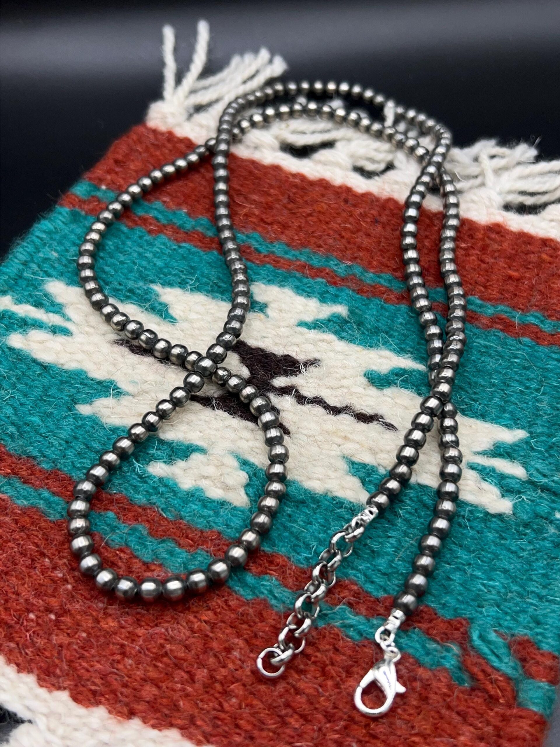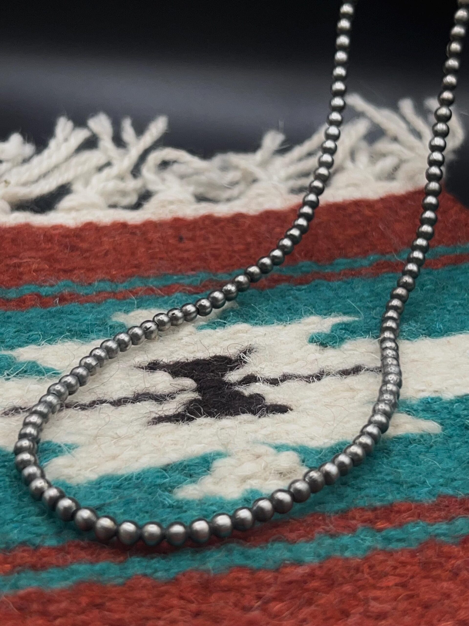 Delicate, timeless, and versatile – our 4mm Navajo Pearl Necklace is the perfect dainty piece for layering or wearing on its own. Choose Between our Authentic Native American Handmade Sterling line or our Silver-Plated beads to suit your style and budget.