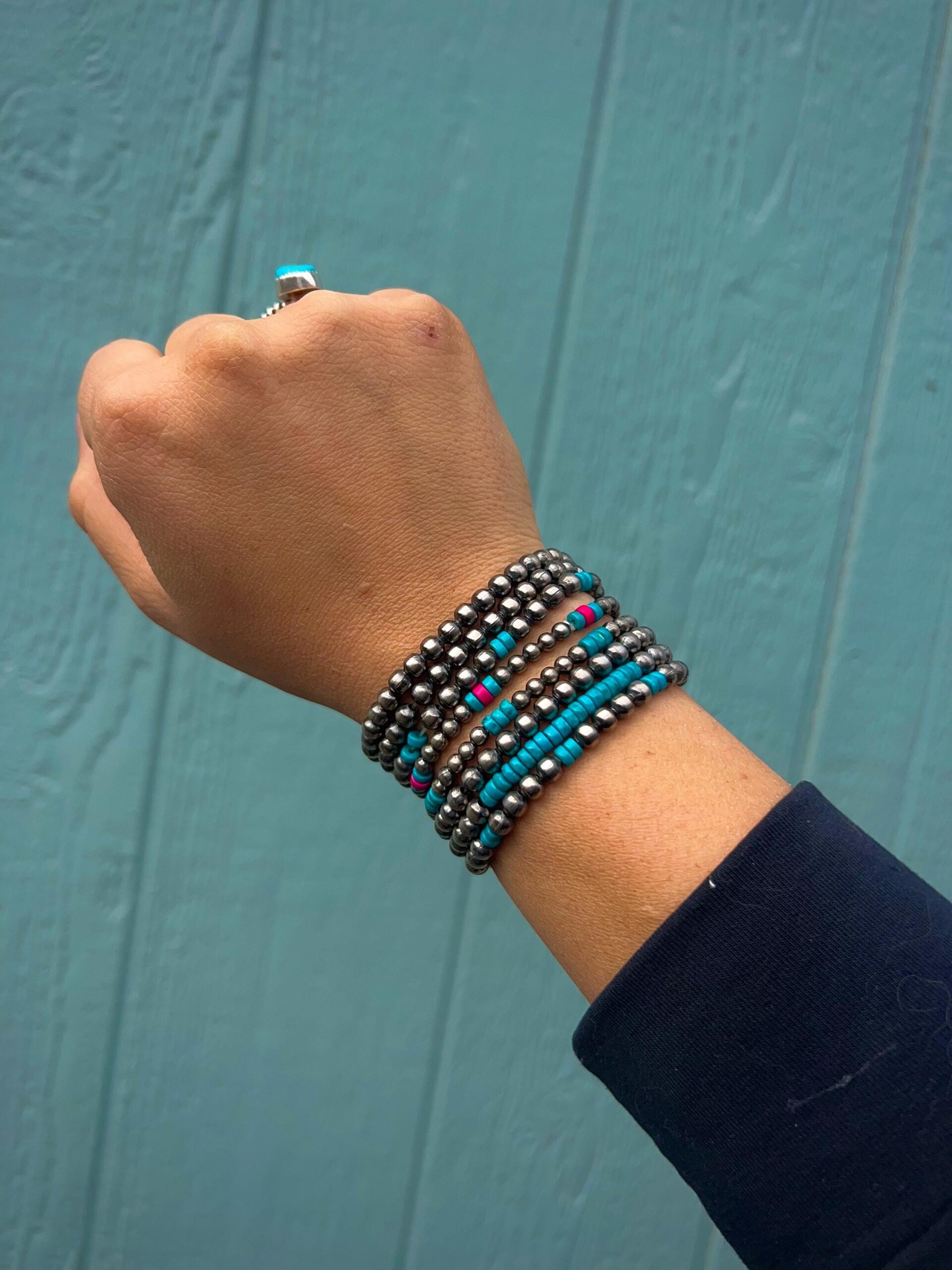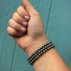Each bracelet is hand strung on a durable elastic cord for a comfortable, slip– on fit– no clasp needed.